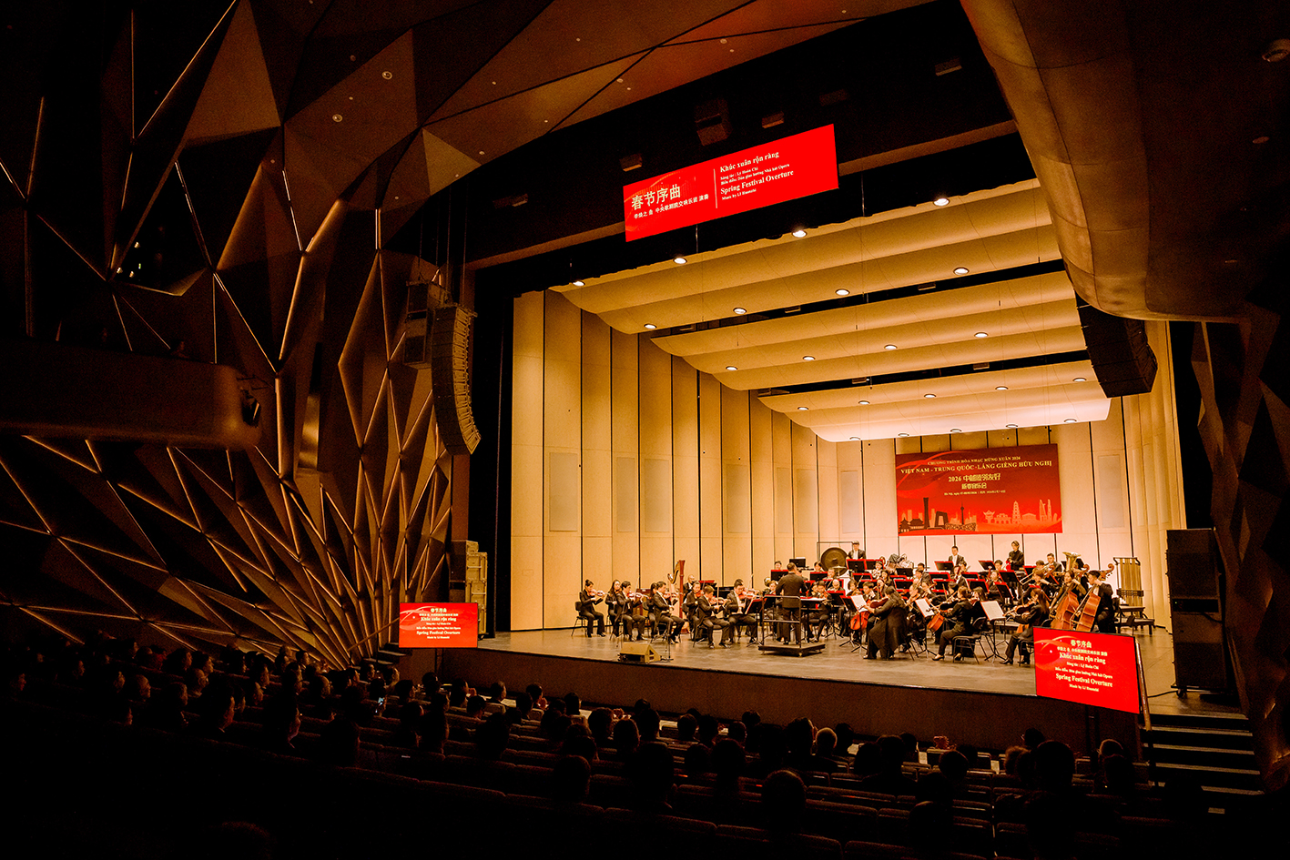 本场音乐会以“华章迎春·故园新韵”“四海和鸣·美美与共”两大篇章构成。上半场以《春节序曲》开篇,节庆气息迅速点亮现场;随后《黄河颂》《父亲的草原母亲的河》等作品以宏阔与抒情交织的表达,呈现中国音乐的精神气度与情感深度;小提琴协奏曲《梁祝》作为上半场收束之作,由中央歌剧院赴越代表团团长、知名小提琴演奏家刘云志担纲演奏,熟悉的旋律流畅铺展,观众的情绪在弓弦起落之间被点燃,不少观众在乐曲推进间动容落泪。