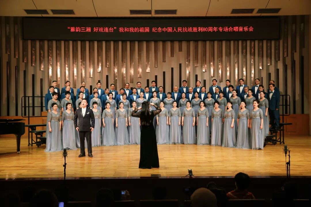 音乐会在混声合唱《中国,我可爱的母亲》中拉开帷幕。深情的告白与澎湃的激情,表达中华儿女对祖国母亲的无限热爱。《到敌人后方去》唱出了游击健儿的机智勇敢与豪迈。一首男声独唱《思乡曲》款款深情,再现烽火连三月,家书抵万金,唤起对家乡与祖国的无限眷恋。男声合唱《弹起我心爱的土琵琶》《中国军魂》则以豪迈的旋律,展现了革命乐观主义精神和中国军人的铁血意志。悠扬婉转的二胡独奏《洪湖人民的心愿》,用民族器乐演绎洪湖人民的心声,诉说了对党、对新中国美好生活的向往;混声合唱《壮美延安》在歌声中回望激情燃烧的岁月。毛主席诗词《十六字令三首·山》,以山喻志,展现红军藐视困难、一往无前的英雄气概。女声独唱《沂蒙山,永远的爹娘》婉转动人,传颂着军民水乳交融、生死与共的深情;女声合唱《唱支山歌给党听》发自肺腑的歌声,表达了对党的深切热爱。穿越时空,感人至深。而我们湖南的《湘妹子》则以细腻的演绎,展现了湖湘儿女的热情、泼辣与坚毅。大气磅礴的混声合唱《爱永在》《没有共产党就没有新中国》将音乐会推向高潮,最后,全体演员与观众齐声高歌《我和我的祖国》,用歌声铭记历史、展望未来,现场气氛热烈,掌声经久不息。