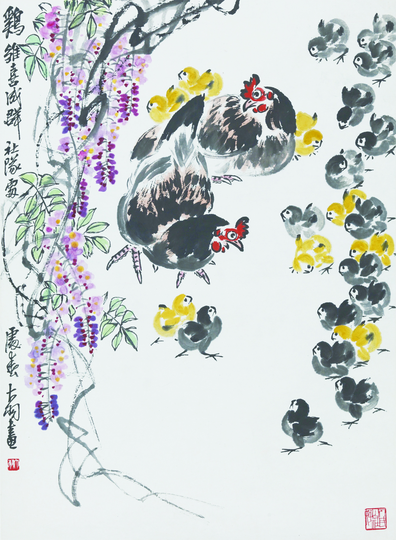 陈大羽爱画鸡,更爱画公鸡。因为鸡不仅被誉有“五德”,还是寻常百姓家中常见之物。陈大羽秉持“当随当代”的创作理念,以独特的笔墨和比兴之法,抒写胸中意气,赞颂美好生活。2012年,“艺无涯——陈大羽百年艺术展”在中国美术馆举办。其间,代表陈大羽多方面艺术成就的50件作品捐赠给国家,入藏中国美术馆。《鸡雏喜成群》这件作品亦在其中。这件作品以内容与形式的完美统一,入选《造型美术(北京版)》一年级(上)教材。