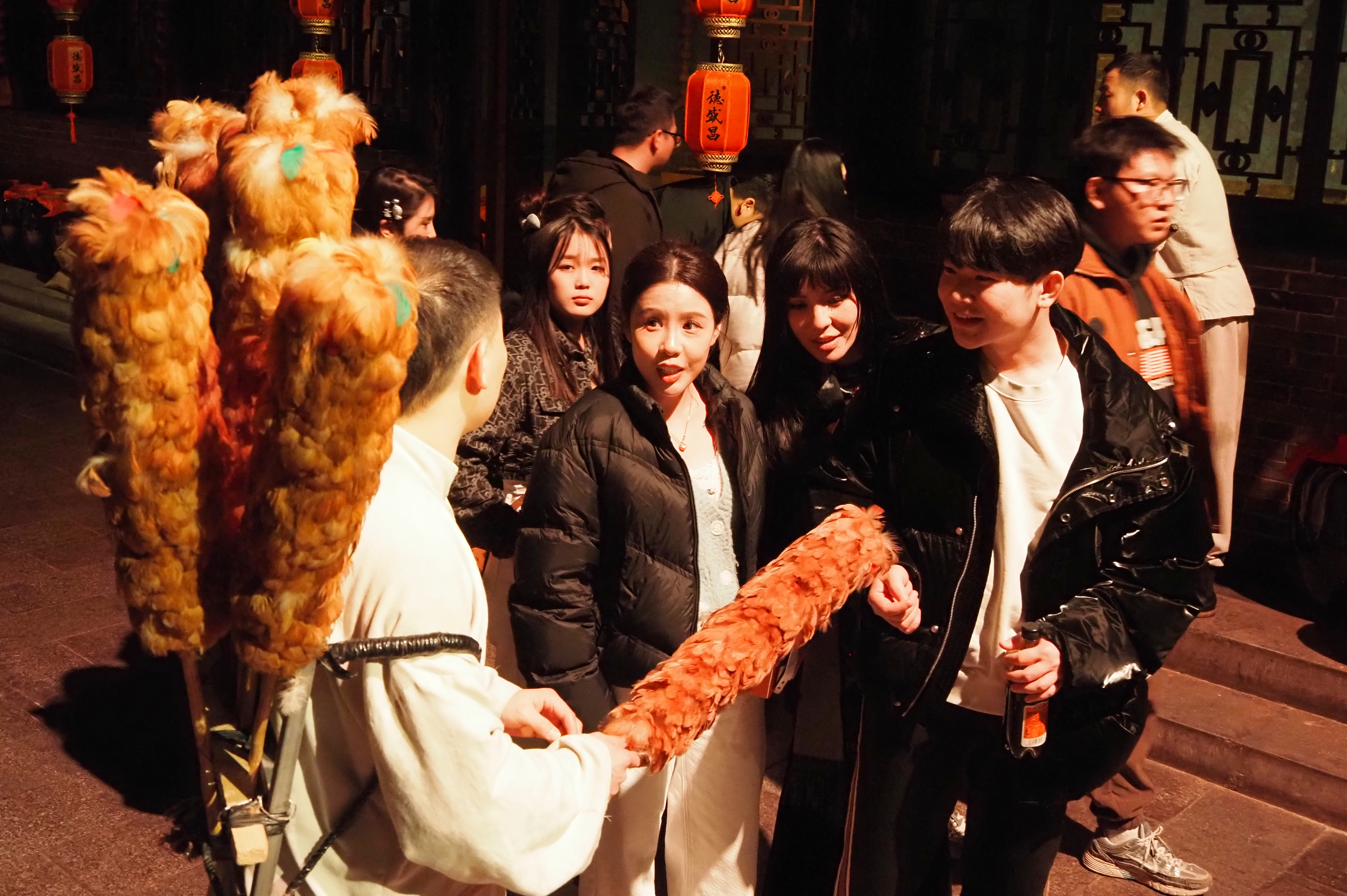 随着故事推进,观众步行穿过若干不同情境的主题空间,灯光与音效随观众移动实时调整,营造移步换景的沉浸感。走在实景搭建的繁华大街,票号、染坊、私塾、绣坊、当铺应有尽有。不诚信的徒弟正被师傅教训、票号伙计点着银子、小商贩热情售卖鸡毛掸子……演员在观剧人群中往来穿梭并与观众对话,每个人都能触发不同的剧情,体验不一样的古城生活场景。