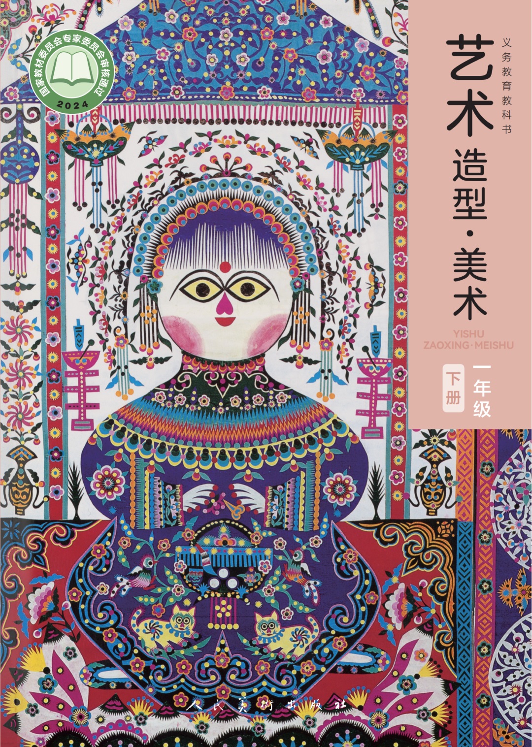 花冠霞帔、盘腿而坐的“剪花娘子”沉浸在由剪纸构建的花花世界中,具有陕西特色、寓意吉祥的图案围绕在她周围,饱满的构图与明艳的色彩极具视觉张力,吸引了小学生的目光……近日,国家级非遗代表性项目旬邑彩贴剪纸代表作《剪花娘子》登上新改版的人民美术出版社教材《艺术造型·美术》一年级下册封面,为学生的成长注入中华优秀传统文化元素。