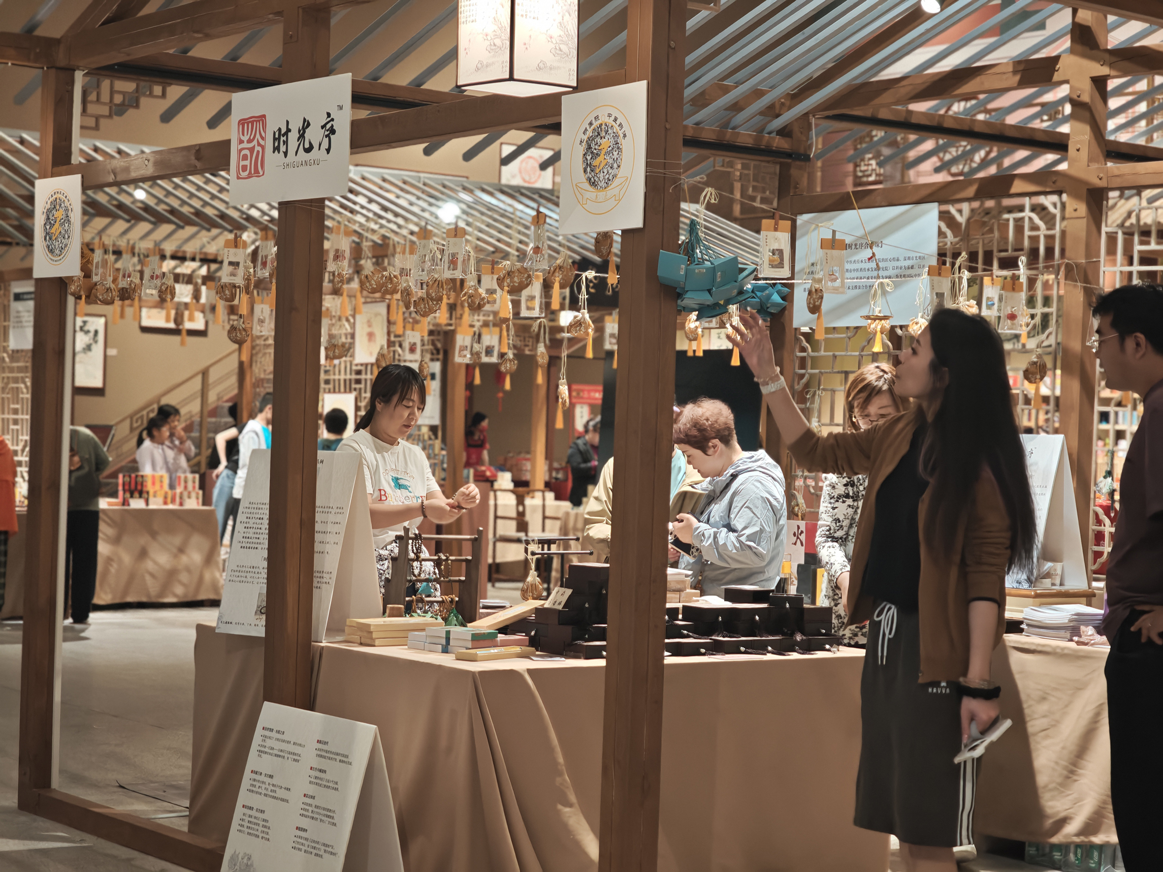 近日,“生生之道——中医药非遗主题展”在中国工艺美术馆(中国非物质文化遗产馆)开幕。展览展示了近50项传统医药类非遗代表性项目,展现中医药融入生活、焕发生机的生动画面。图为展览现场,中医药非遗文创产品受到观众喜爱。