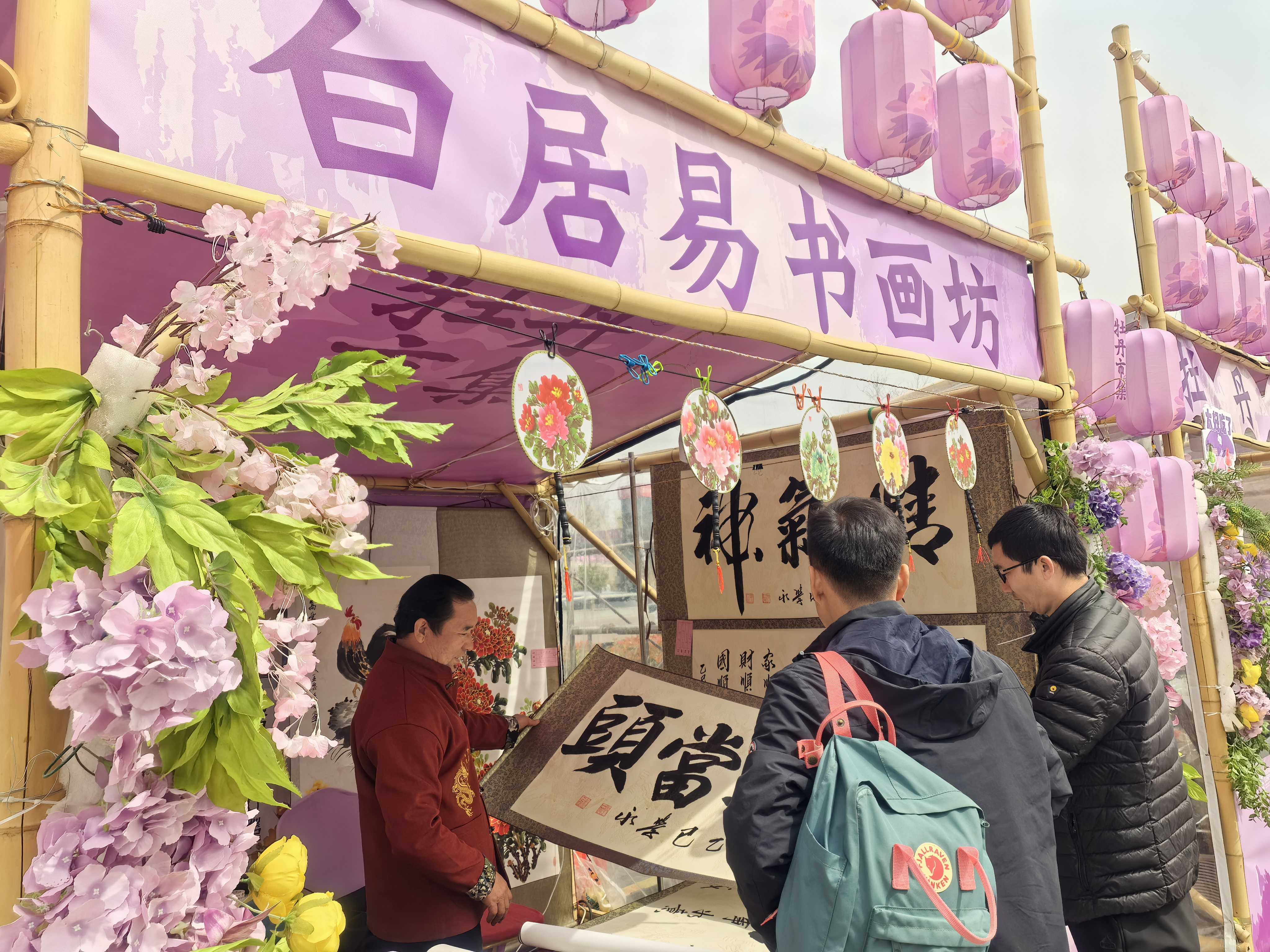 洛阳牡丹文化节期间,顾客在龙门古街的市集上选购书画作品。 张莹莹 摄