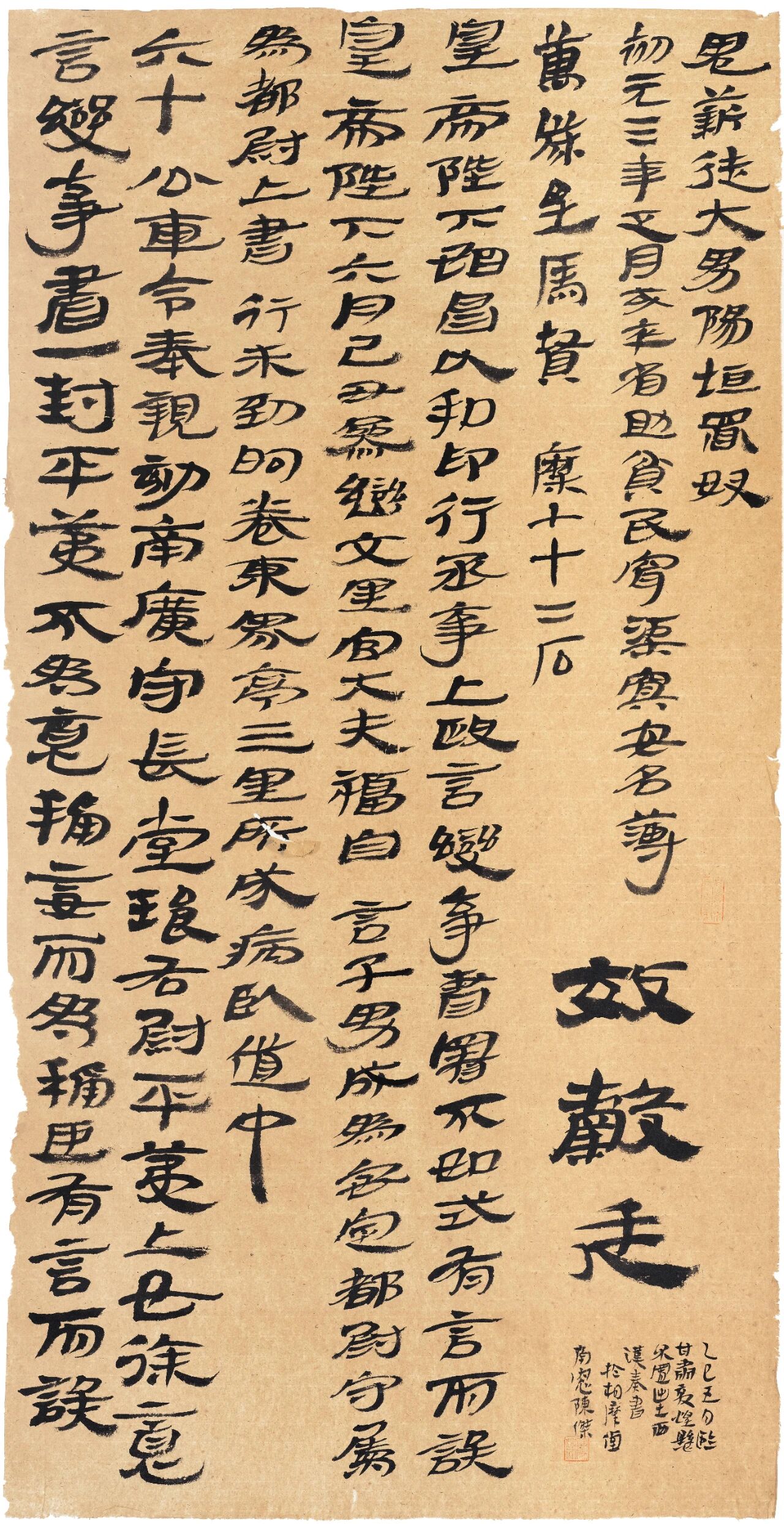 此次展览他带来了“一临一创”的作品,“我写的是楚简,临的是郭店楚简,创作的是一件风格相近的楚简作品。简帛书字形活泼、用笔灵动率真,但线条偏细、飘、薄。因此我用大篆笔法,特别是金文笔法的厚重来融汇简帛书,让两者相得益彰。”在高庆春看来,学习简牍书法,必须以篆书、隶书为根基,再加以融会贯通,绝非简单照抄照搬。此外,古文字基础、对书法史的研究理解与实践经验,缺一不可。