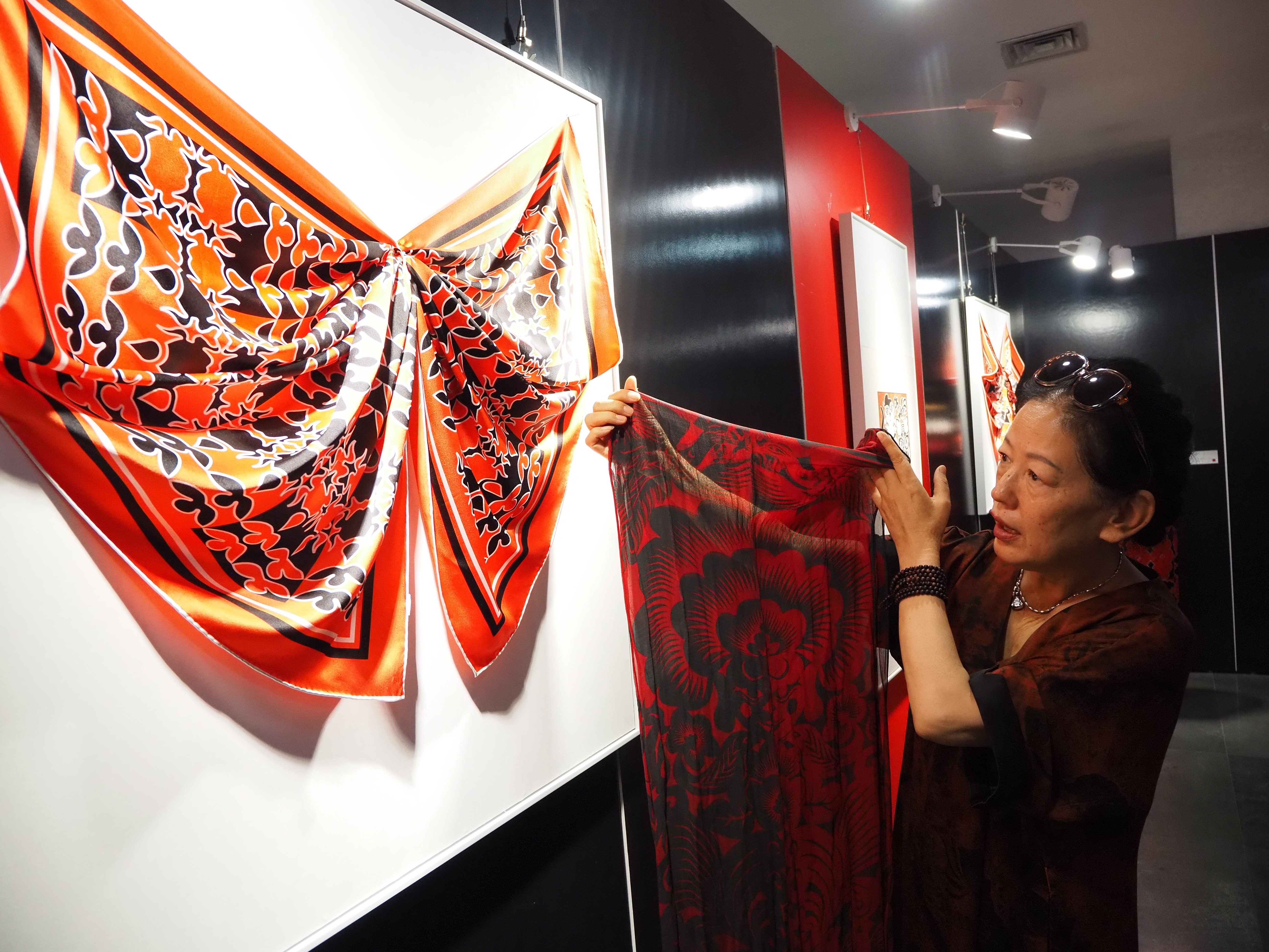 步入展厅,一组以“人生四大喜”为主题的丝巾映入眼帘,规则的纹样和黑红主色调极具视觉冲击力。“久旱逢甘霖”“他乡遇故知”“洞房花烛夜”“金榜题名时”,这四件喜事被剪纸艺术家以刀尖为笔,化作跃然纸上的灵动。这些纹样又从红纸间“走”出来,在丝巾上绽放百态风情。