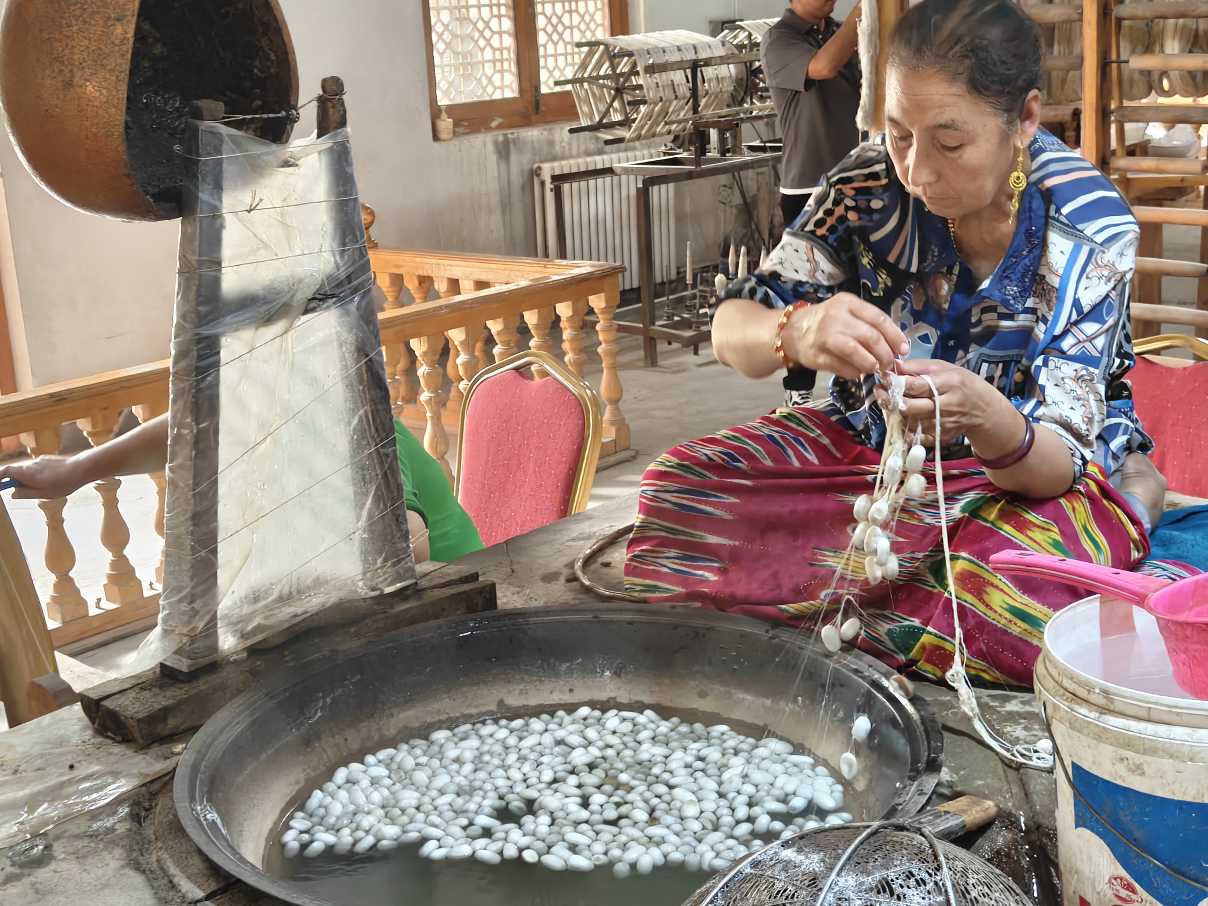 走进抽丝车间,村民云吉来木汗·艾买尔正和同事进行抽丝和并丝,硬邦邦的蚕茧煮好后,工人从表皮将蚕丝抽出来,接着进行搓捻,把比头发丝还细的丝合并搓成一根根合格的丝线。一天下来,云吉来木汗能抽丝4千克。