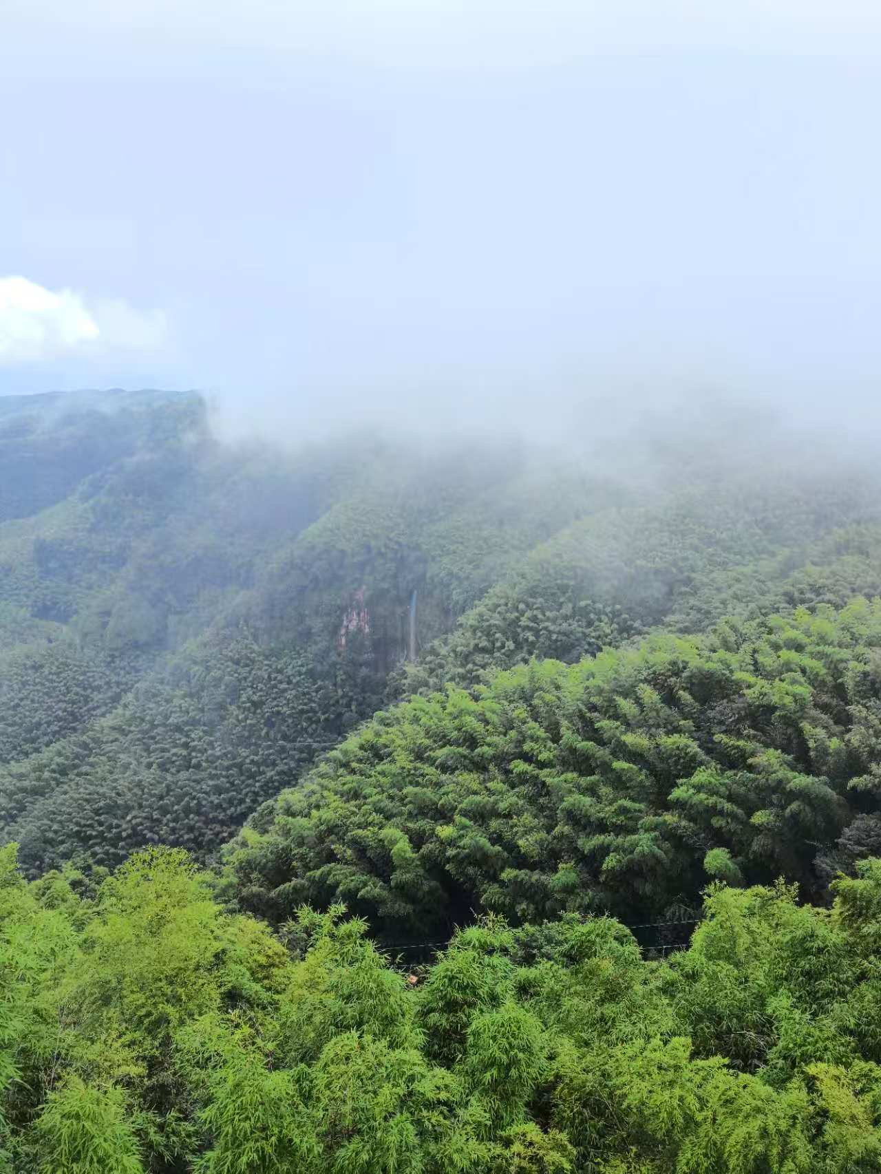 山雾久久不散,我们只好带着几丝遗憾下楼。再次来到二楼时,没想到大雾正往两侧飘散,片刻后,天幕开启,世界一下敞亮起来。极目远眺,浩瀚无边的竹海尽收眼底,层层叠叠的翠竹随山势起伏,宛如绿色的波浪。风拂过时,竹海泛起涟漪,蔚为壮观。这时,有人喊道:“看,瀑布!”顺着她手指的方向望去,果见右侧竹峰上,一条细瀑飞悬,好似白色绸带与竹海相互映衬,妙趣无穷。有那么一瞬,我竟觉得自己穿越到了宋代,黄庭坚美髯飘飘,正在向我讲述那些关于“竹之七德”的故事……