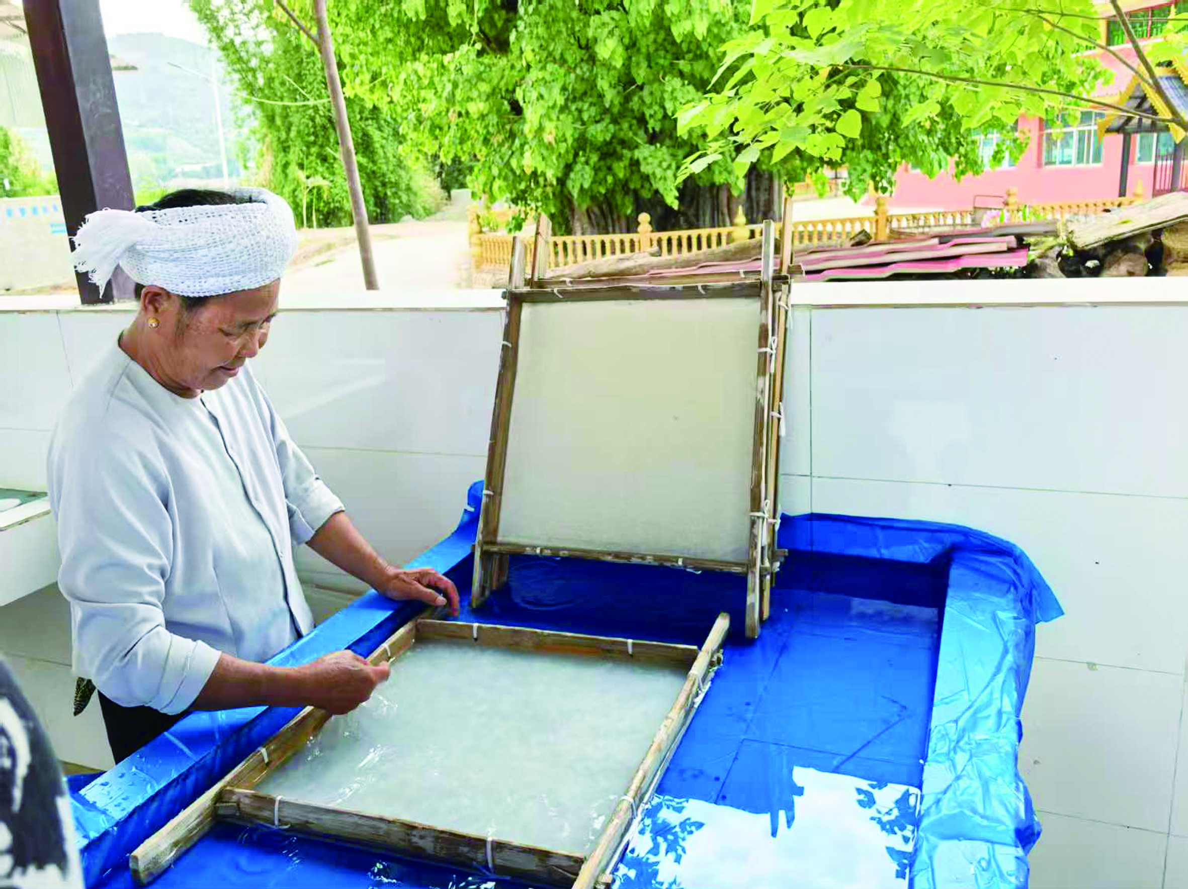 国家级非遗项目傣族手工造纸技艺传承人金小页为参加培训的残疾人做演示 永德县委宣传部供图