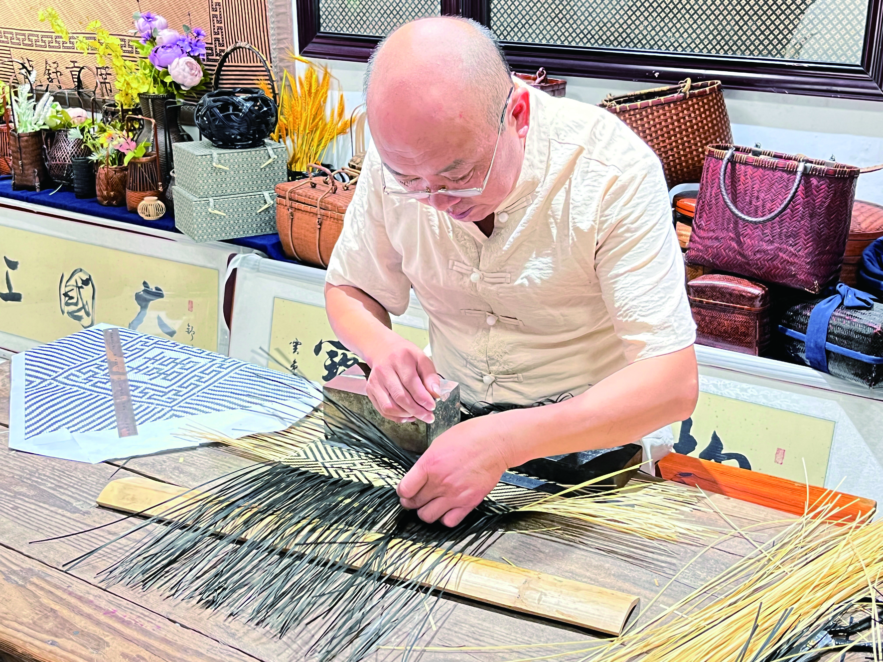 他们也在线上开了店,走进直播间,为传统工艺吆喝。苏成军说,2024年的一次直播,他现场剖篾编织,几万网友围观叫好。“这就是传统文化的魅力,是产品创新的灵魂。”苏成军感慨,他坚持在传统工艺的基础上创作,2021年,他的舒席作品被中国大运河博物馆永久收藏。
