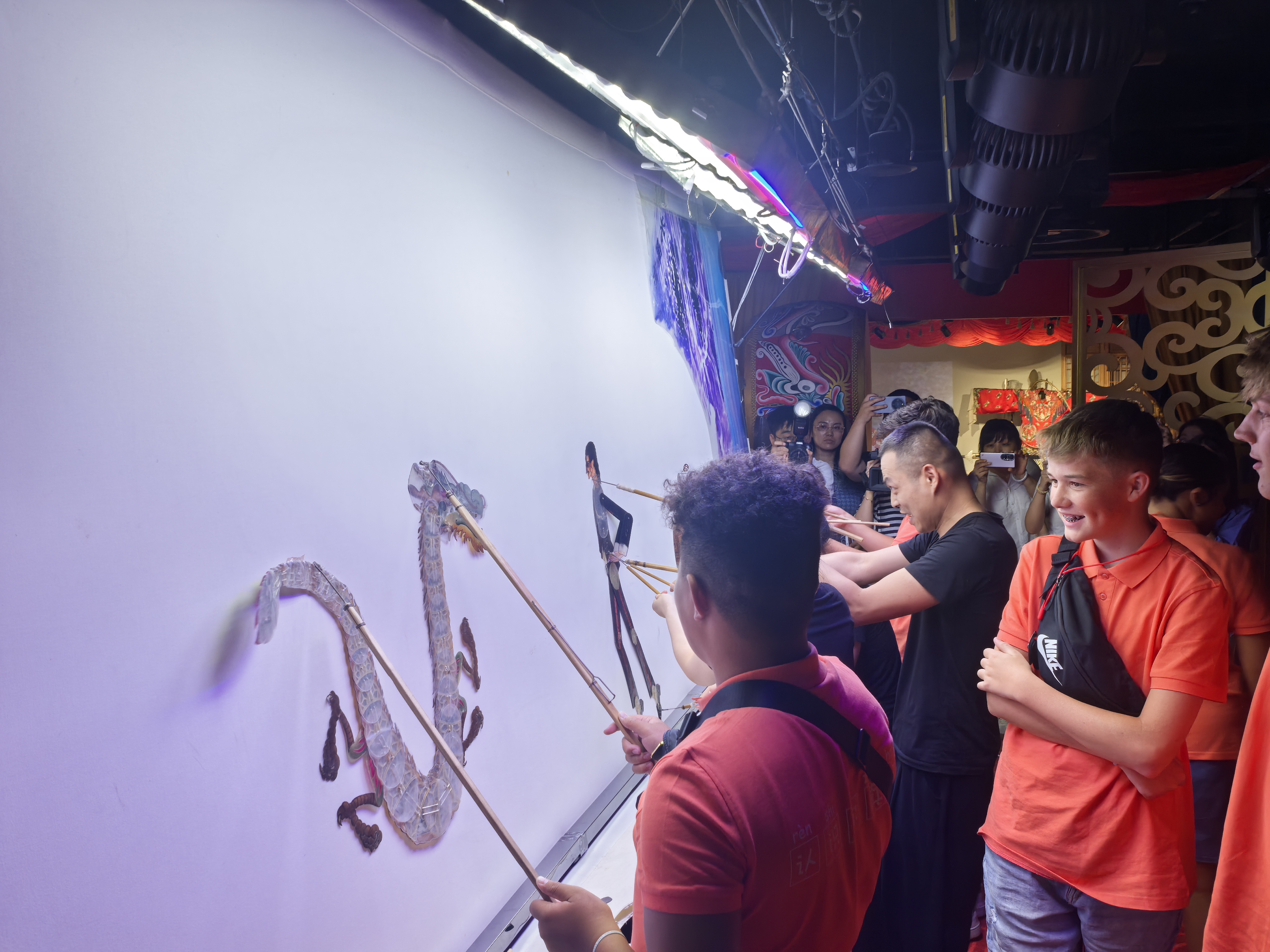 演出过后,皮影艺人化身为老师,把舞台留给了年轻人,于是“迈克尔斗龙王”的新戏上演了。操纵着不同人物形象的同学,“技术不足热情凑”,让各皮影做出各种匪夷所思的动作,引得台下笑声连连,现场氛围十分活跃。幕布上舞动的光与影,让中西文化紧密交织在一起,也让两国青少年心贴心。