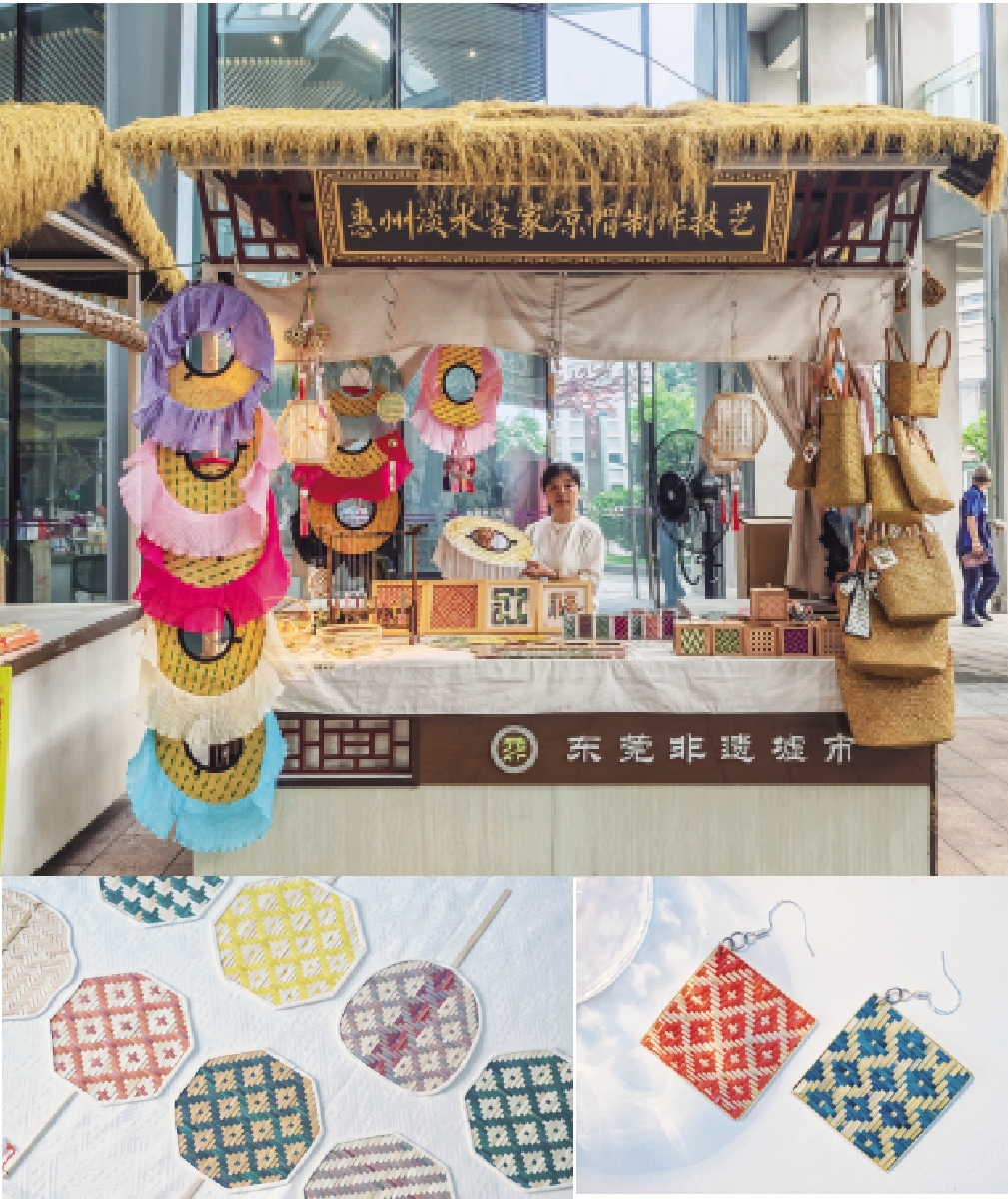 (图为非遗墟市上展示的客家凉帽以及用凉帽制作技艺设计推出的文创产品,由客家凉帽制作技艺市级代表性传承人陈瑾瑜提供。)