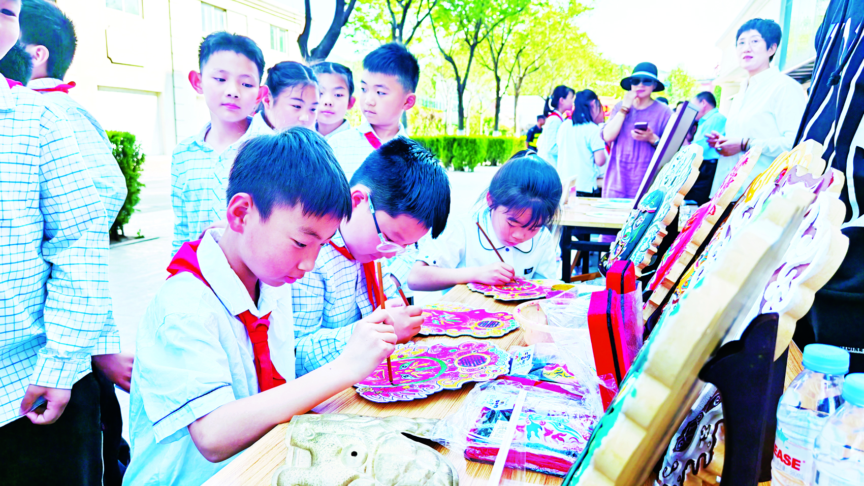 近日,由山东省济南市文化和旅游局主办,济南市文化馆(济南市非物质文化遗产保护中心)、济南市历下区文化和旅游局承办的“中国梦·非遗行”文化传承系列公益活动走进济南锦屏学校。20余位非遗传承人通过现场宣讲、展演展示、互动体验的形式,为学校近千名师生带来一场别开生面的文化体验活动。图为孩子们绘制侯氏社火脸谱。
