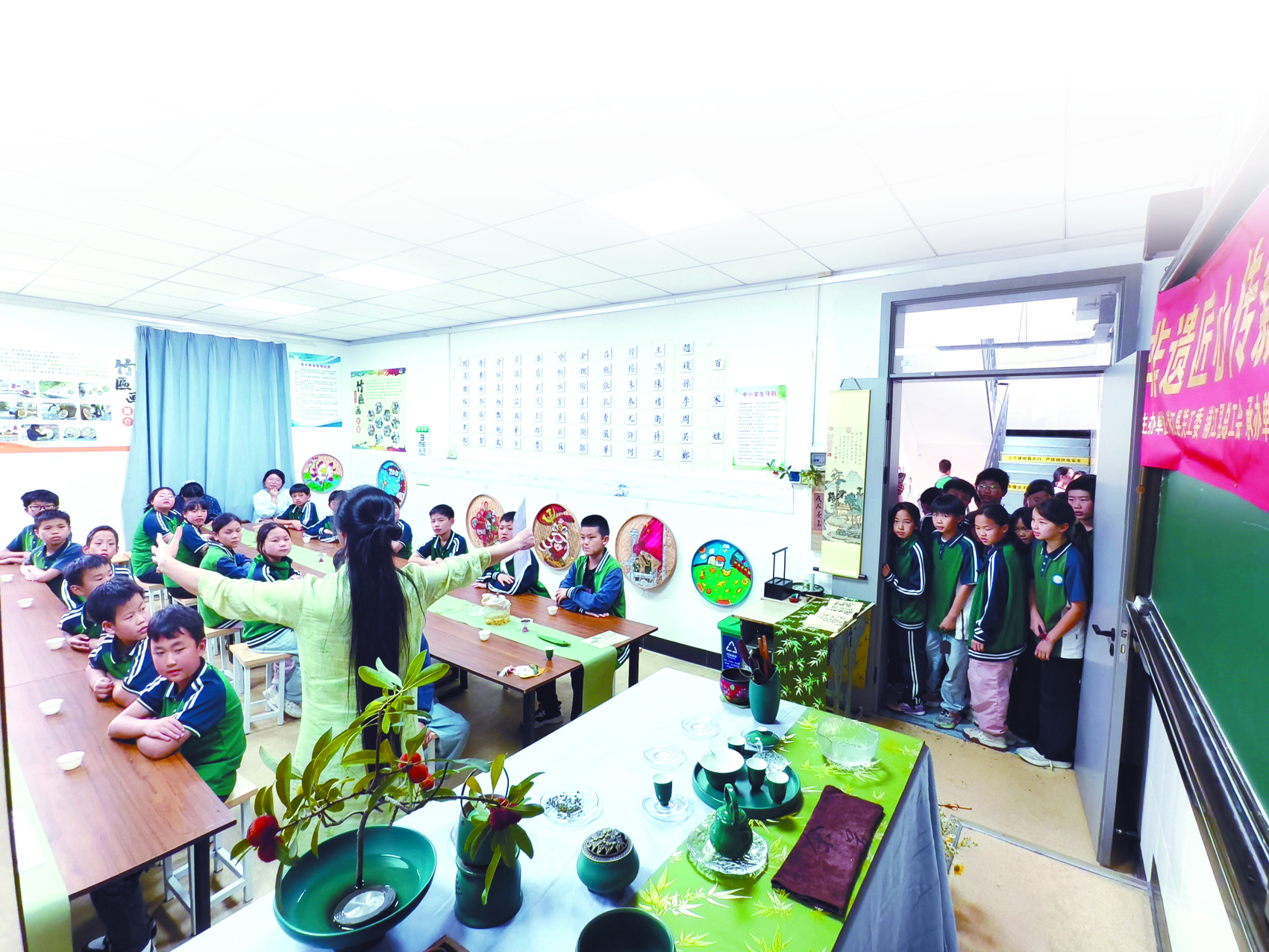 近日,浙江省金华市浦江县非遗保护中心走进大畈乡金融希望小学,开展“非遗匠心传薪火,劳动思政育少年”主题思政课。课堂上,工作人员展示了中国传统制茶技艺以及相关习俗,让青少年沉浸式感受中国茶的魅力。图为思政课现场。