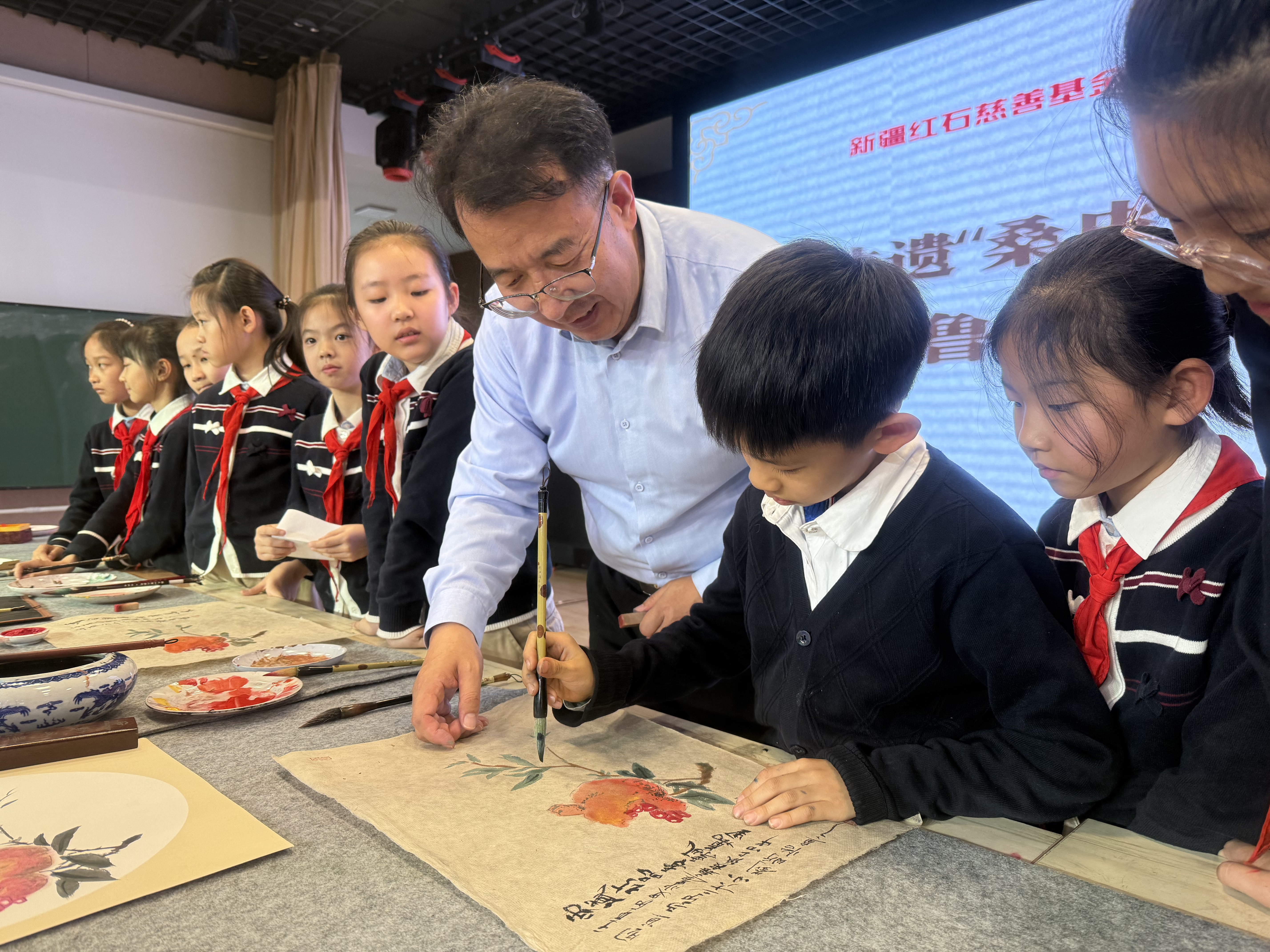 近日,新疆润疆国画院携桑皮纸画走进乌鲁木齐市第38小学。图为桑皮纸画市级非遗代表性传承人魏宝山指导学生制作桑皮纸画。