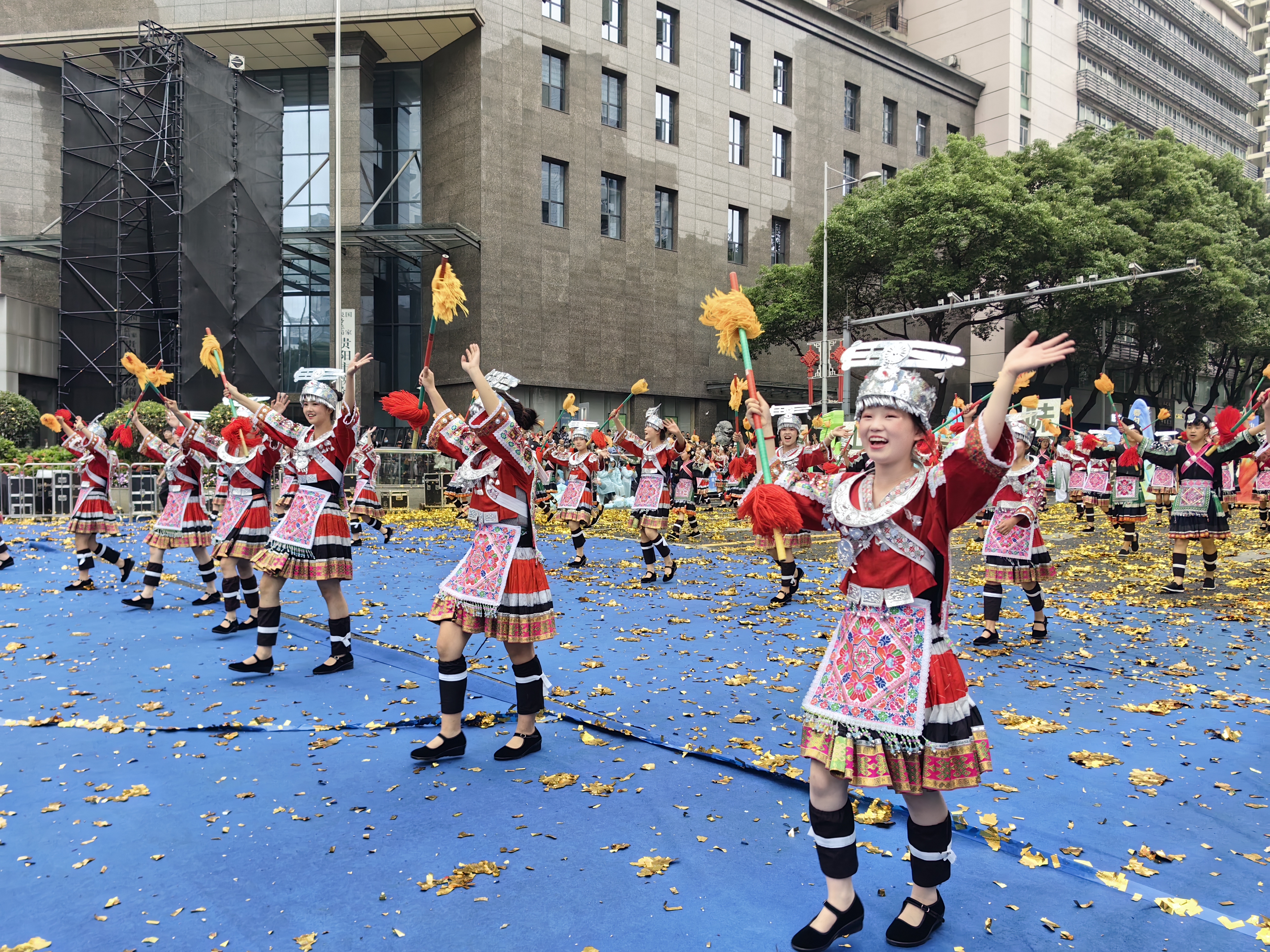 图为下坝九年制学校师生在贵州民族团结大巡游活动中表演花棍舞。